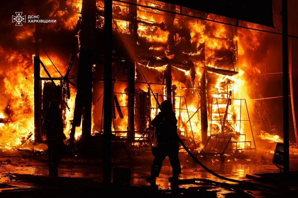 Зокрема, під удар потрапив ринок у Київському районі Харкова. Там горять торговельні павільйони на загальній площі 2800 м².