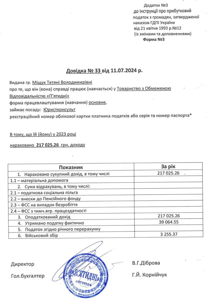 Особливістю всіх трьох аукціонів є те, що ТОВ «П’ятидні» конкурувало з Тетяною Міщук, яка лише незначно піднімала ціну. Як зазначено в поданій на торги документації, Тетяна Міщук працює юрисконсультом ТОВ «П’ятидні». Серед документів – довідка про доходи за 2023 рік, яку особисто підписав директор компанії Валерій Діброва. Втім це не завадило їй конкурувати з роботодавцем на земельному аукціоні.
