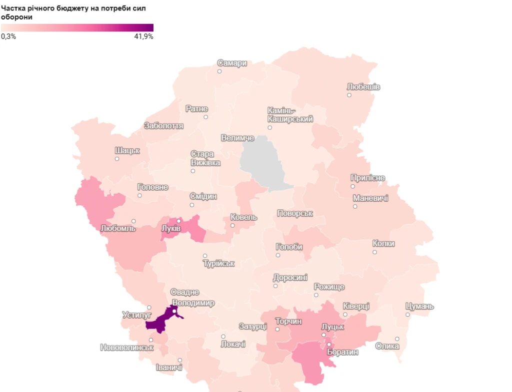 Менше одного відсотка річних бюджетів на підтримку Сил оборони пішло ще в 11 громад. Серед них Рожищенська (2,5 млн грн), Камінь-Каширська (4,5 млн грн) та Берестечківська (685 тис грн) міські громади.