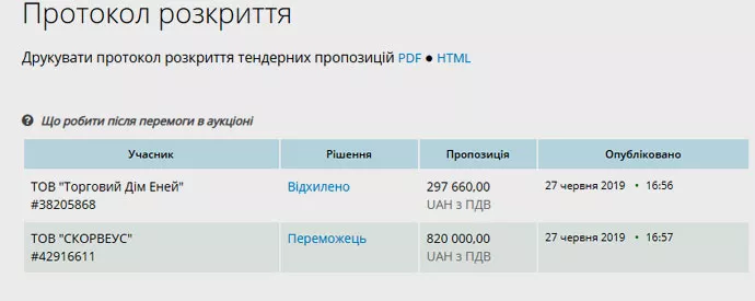 При цьому відзначається, що Укрзалізниця відхилила втричі дешевшу пропозицію конкурента – ТОВ “Торговий Дім Еней”, через те, що останній не завірив скан-копію статуту в складі пропозиції та не надав документи про попередній досвід виконання контрактів.