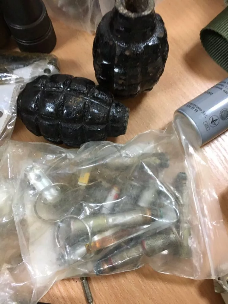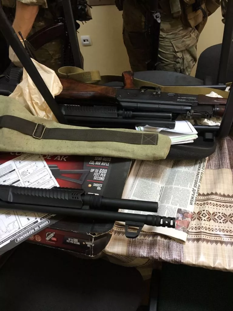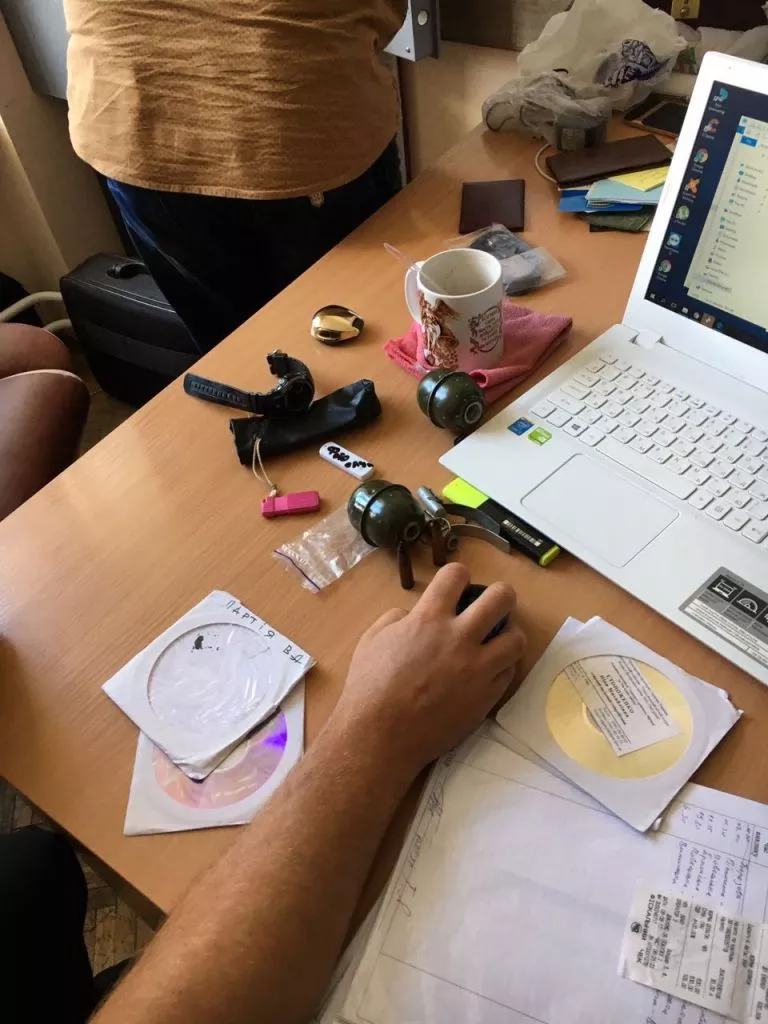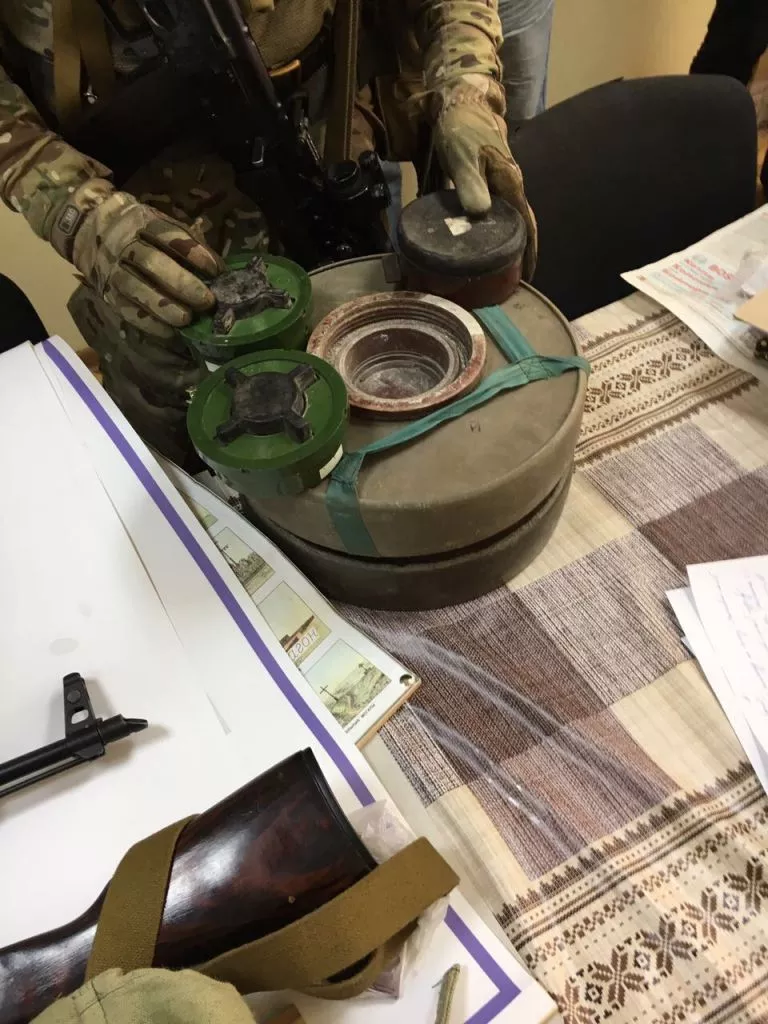 У ході обшуків офісних приміщень, жилих будинків та автомобілів зловмисників слідчими СБУ вилучено спеціальні засоби негласного отримання інформації, карти пам’яті із фотографіями, зброю різних калібрів, набої до неї, гранати Ф-1, протипіхотні міни.