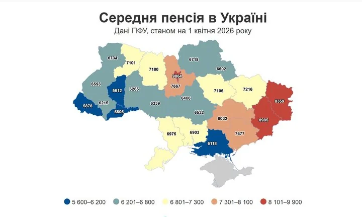 Найвищі пенсійні виплати у столиці (9864 грн), найнижчі — на Тернопільщині (5612 грн). Загалом у 8 регіонах виплати дотягують до середнього рівня або перевищують його.
