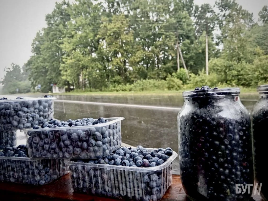 Незважаючи на дощову погоду, уздовж траси біля Шацька місцеві мешканці продають літні дари лісу: чорниці, лохину та лисички. Продукцію розставили у пластикових контейнерах і банках просто обабіч дороги.