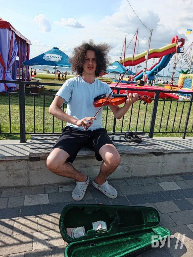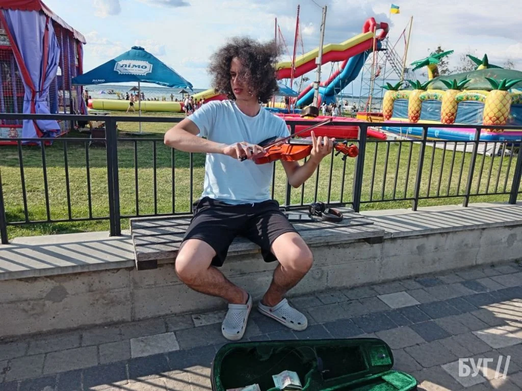 Хлопець сів просто на лавці, неподалік надувних атракціонів і виконував музику для відпочивальників. Поруч поставив футляр для скрипки, куди перехожі кидали гроші.