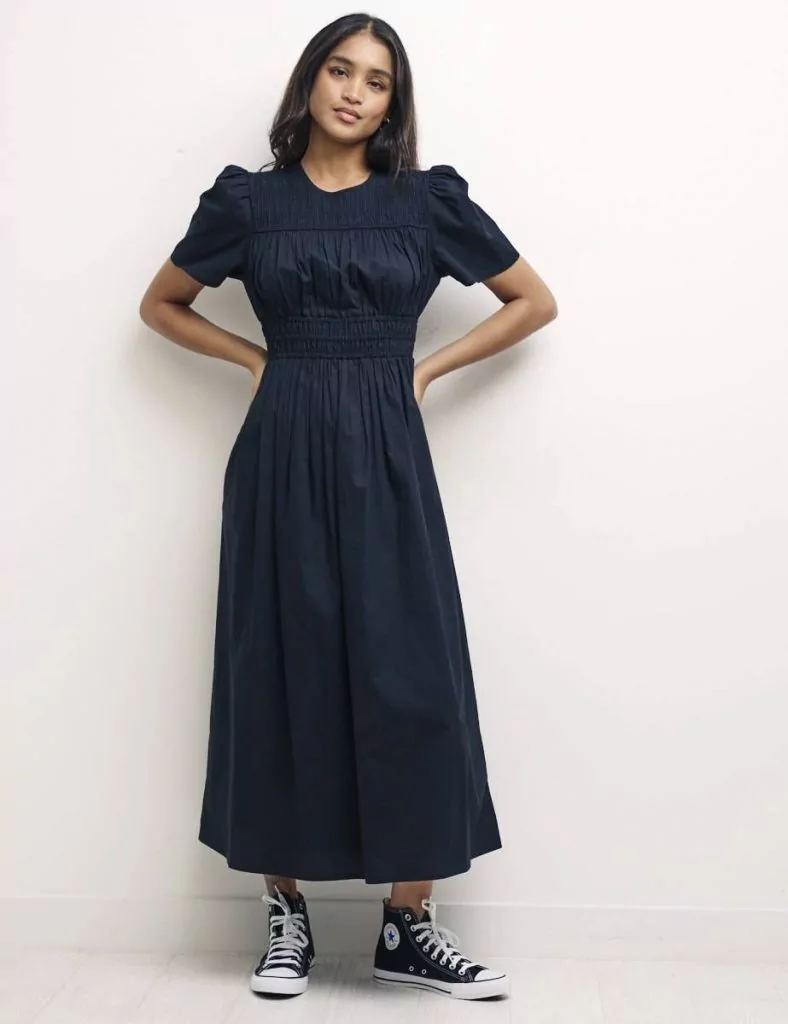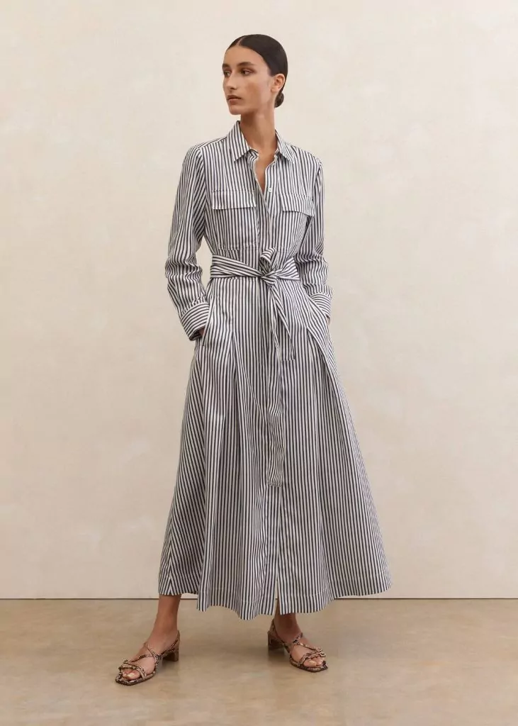 Також на осінь можна приглянути одну або кілька варіантів сукні міді – тобто довжиною зазвичай на долоню вище або нижче коліна, в деяких – до середини ікри. Наприклад, стильну чорно-білу сукню-сорочку в смужку можна поєднувати як із балетками, так і з високими чоботями. Також можна приглянути трикотажне плаття молочного кольору в рубчик або універсальне чорне плаття.
