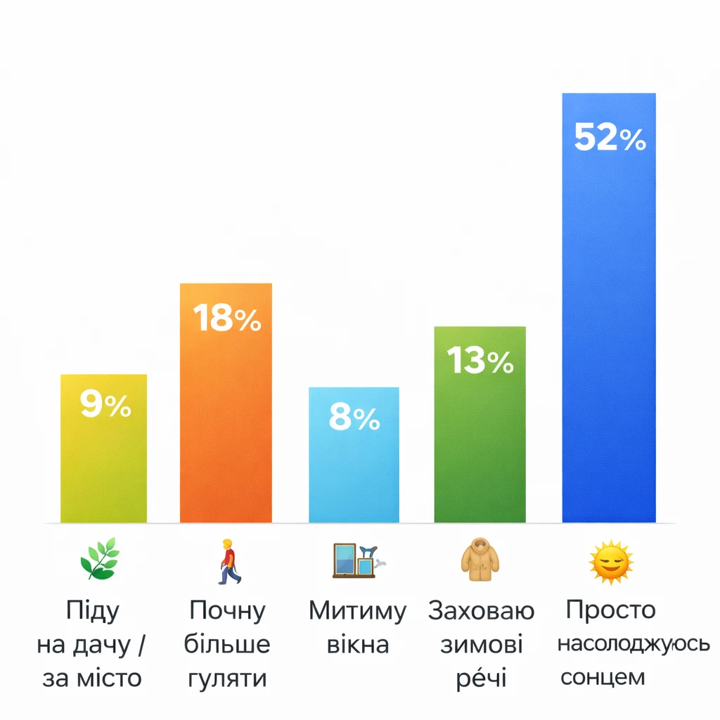 За результатами опитування, найбільше людей — 52% — обрали варіант “просто насолоджуватись сонцем”. Це свідчить про те, що після холодної пори року багато хто хоче просто відчути теплі дні та гарну погоду.