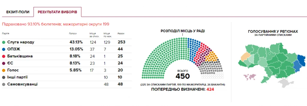 За даними паралельного підрахунку голосів “Слуги народу”, ця партія може отримати 253 місця у Верховній Раді ІХ скликання. Це абсолютний рекорд підтримки за всю історію незалежної України. До цього за списками найбільше набирала “Партія регіонів” на виборах 2007 року – 34,37%.