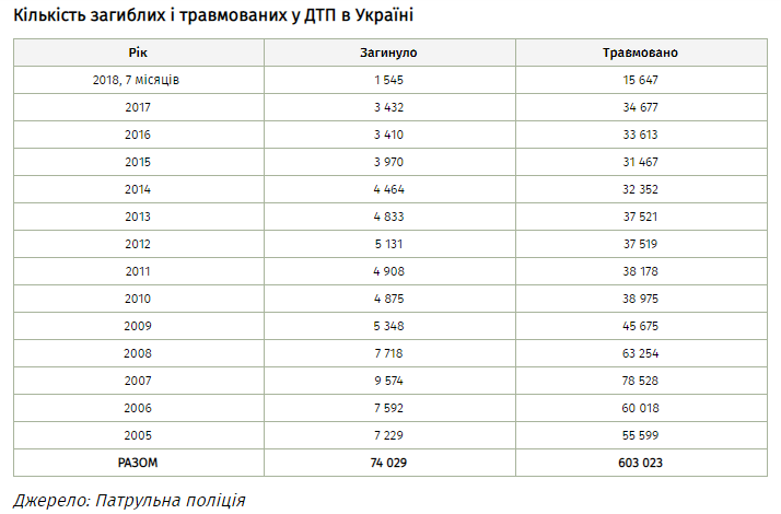 За 15 років ведення офіційної публічної статистики в Україні загинуло в ДТП 74 тисяч осіб і ще 603 тисячі осіб отримали травми.