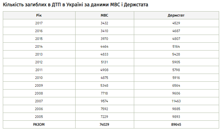 Такі офіційні дані зібрав для “Економічної правди” Всеволод Некрасов у статті “Смерть на дорозі: що приховує офіційна статистика про ДТП в Україні“.