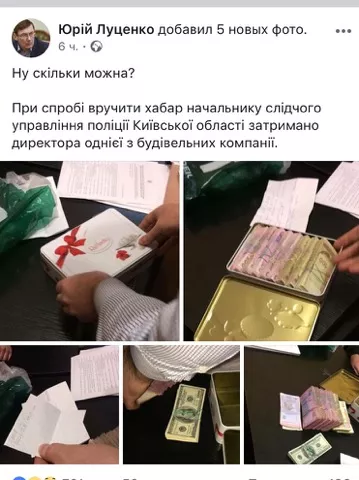 Прокуратурою Київської області спільно зі співробітниками Київського обласного управління внутрішньої безпеки Департаменту внутрішньої безпеки Національної поліції України задокументовано факт надання громадянином, який діяв в інтересах юридичної особи, слідчому поліції неправомірної вигоди, – дописує у фейсбук прес-секретар Луценка Лариса Сарган.