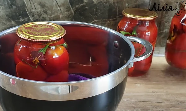 4. Гарячим маринадом залийте помідори, накрийте кришками і поставте банки в каструлю з водою для стерилізації.