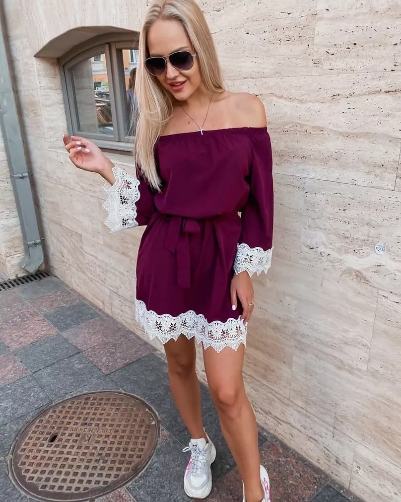 Для розслабленого луку пригляньте сукню міні з контрастним мереживом, яку можна носити, кокетливо приспустивши плечі. Доповнять образ непомітні прикраси і білі кросівки.