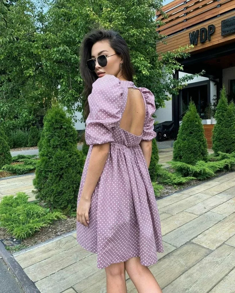 А для святкового виходу в світ підійде мініплаття в горошок з об’ємними рукавами і оригінальним вирізом на спині. Носити його можна з білими кросівками, а доповнити лук маленькою сумочкою через плече.