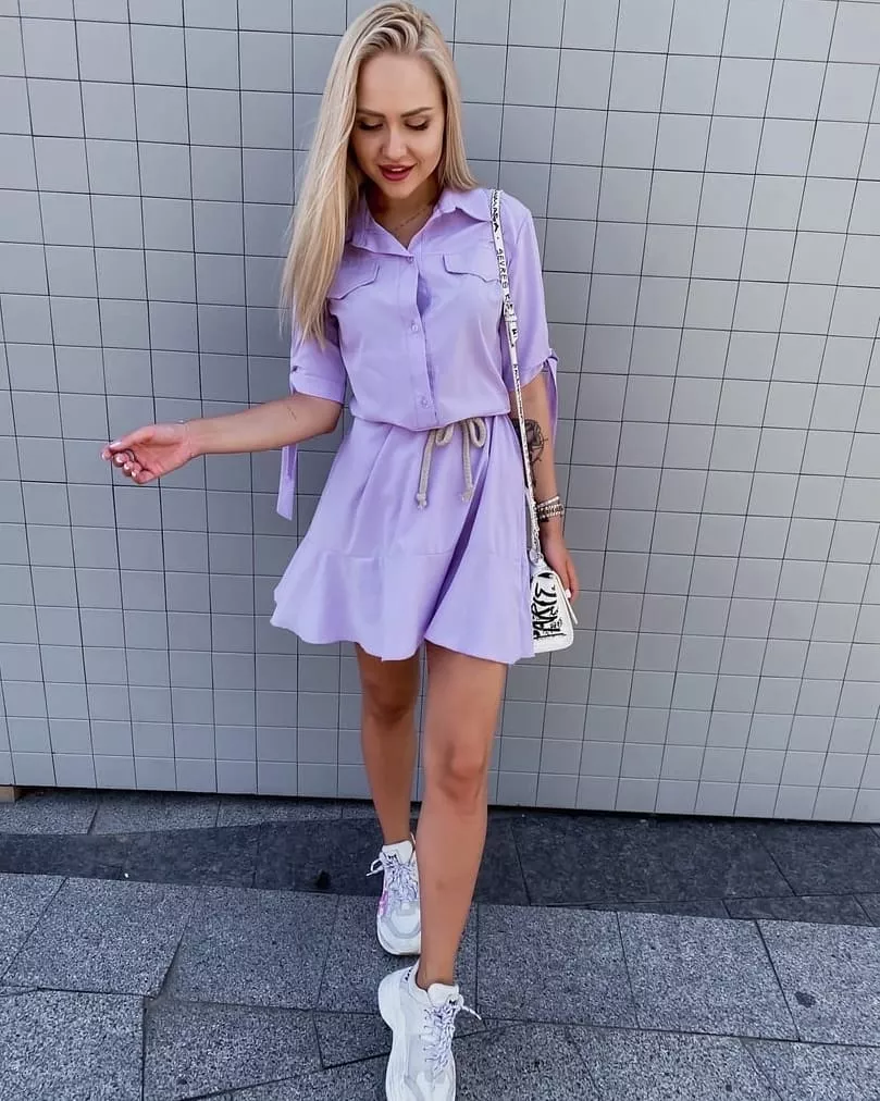 Ще один стильний варіант – сукня-сорочка і кросівки. У такому вигляді сміливо можна відправитися навіть в офіс – але тільки в тому випадку, якщо у вас немає строгого дрес-коду.