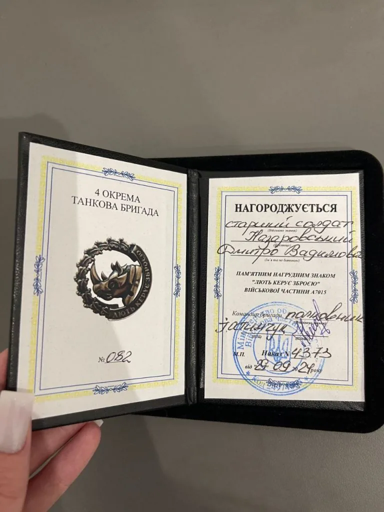 Бойові заслуги Дмитра Назаровського були неодноразово відзначені командуванням, хоча сам він ніколи не хизувався нагородами. Його шлях – це шлях відданості, закарбований у наказах та відзнаках. Вже у вересні 2022-го року він отримав подяку за особисту мужність та героїзм, а згодом, у грудні, був удостоєний грамоти за сумлінне виконання обов’язку як старший солдат роти охорони. Дмитро опанував складну професію механіка-водія у складі інженерно-саперної роти військової частини А7015, де його професіоналізм також був відзначений почесною грамотою.