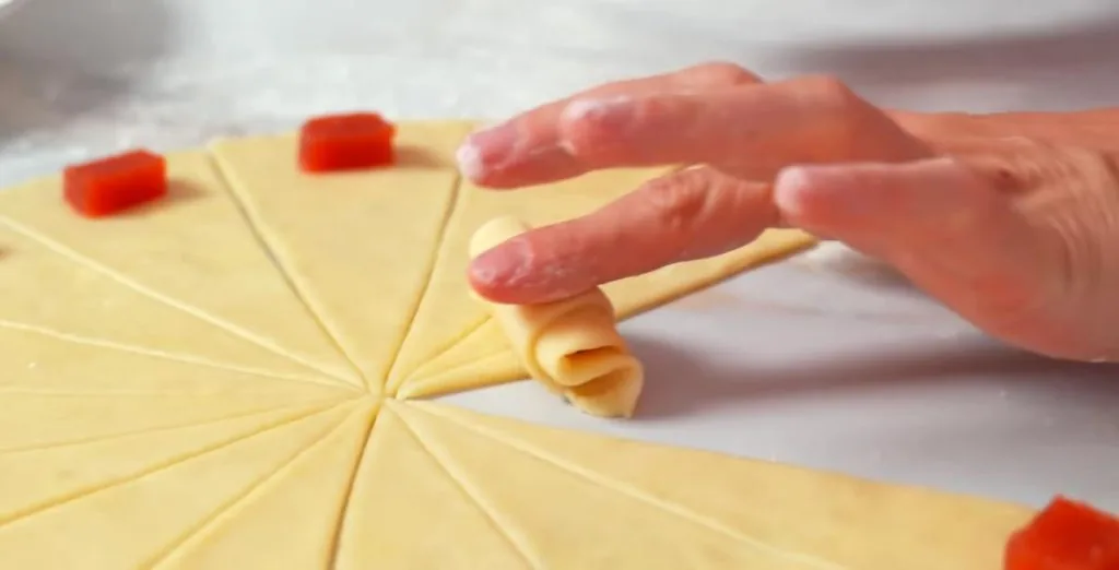 Тісто тонко розкачайте. Наріжте трикутниками, викладіть начинку і закатайте. Випікайте рогалики на смальці за 180° близько 15-20 хвилин. Залиште печиву вільне місце на деку, оскільки воно підніметься після випічки.