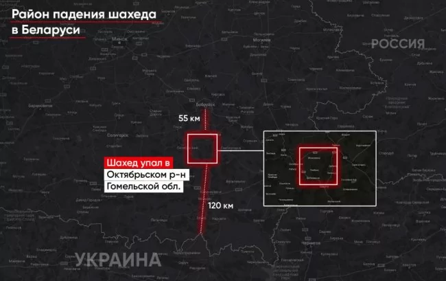 “За нашими даними, шахед упав між г.п. Паричі та аг. Любань Гомельської області, що за 55 км від міста Бобруйск і за 120 км від кордону з Україною. Більше того, нам достеменно відомо, що під час падіння стався вибух дрону-камікадзе, що прямо підтверджує — “шахеди”, які залітають на територію Білорусі, — ніякі не «навчальні» чи «розвідувальні», а реальні з боєкомплектом на борту. І призначалися вони для атаки по території України”, – йдеться в повідомленні.