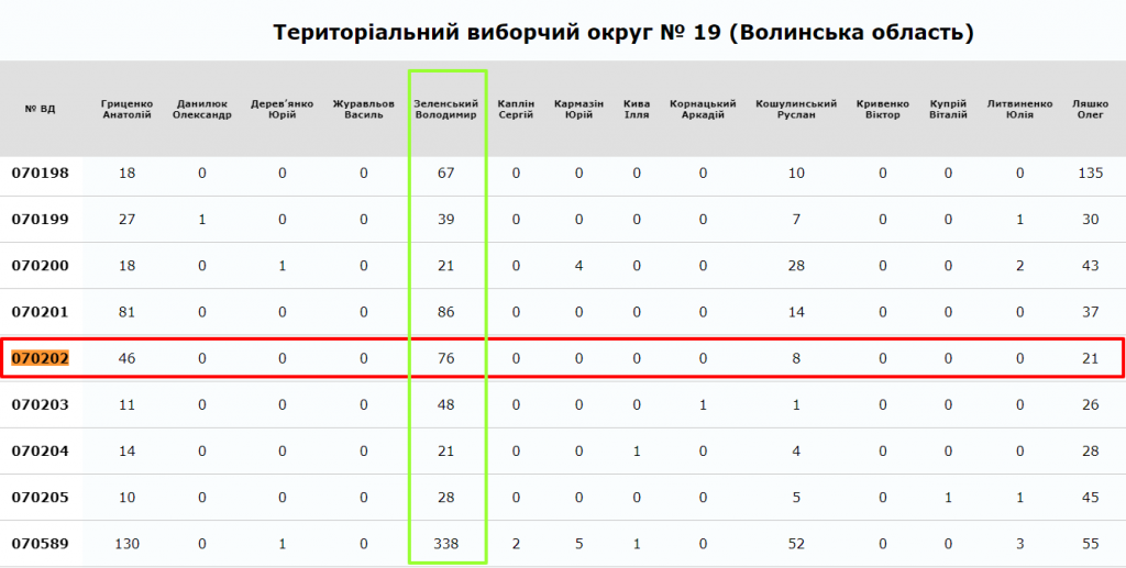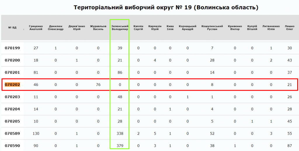 На сайті ЦВК у результатах голосування виборчого округу №19 журналісти інтернет-видання «БУГ» помітили, що на виборчій дільниці в селі Будятичі Іваничівського району за лідера 1-го туру президентських перегонів Володимира Зеленського не віддали жодного голосу. Це здалося дивним, адже за кандидата Василя Журавльова віддали свій голос 76 виборців із 362. А кандидат Журавльов по всьому виборчому округу набрав лише 114 голосів.