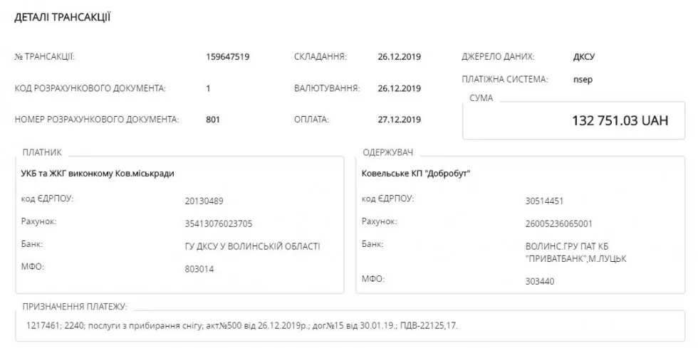 Комунальне підприємство «Добробут» отримало від управління капітального будівництва та житлово-комунального господарства виконкому Ковельської міської ради 132 751,03 грн. за послуги з прибирання снігу. Про це свідчать документи: трансакція від 27 грудня 2019 року та підписаний посадовцями напередодні акт виконаних робіт № 500.