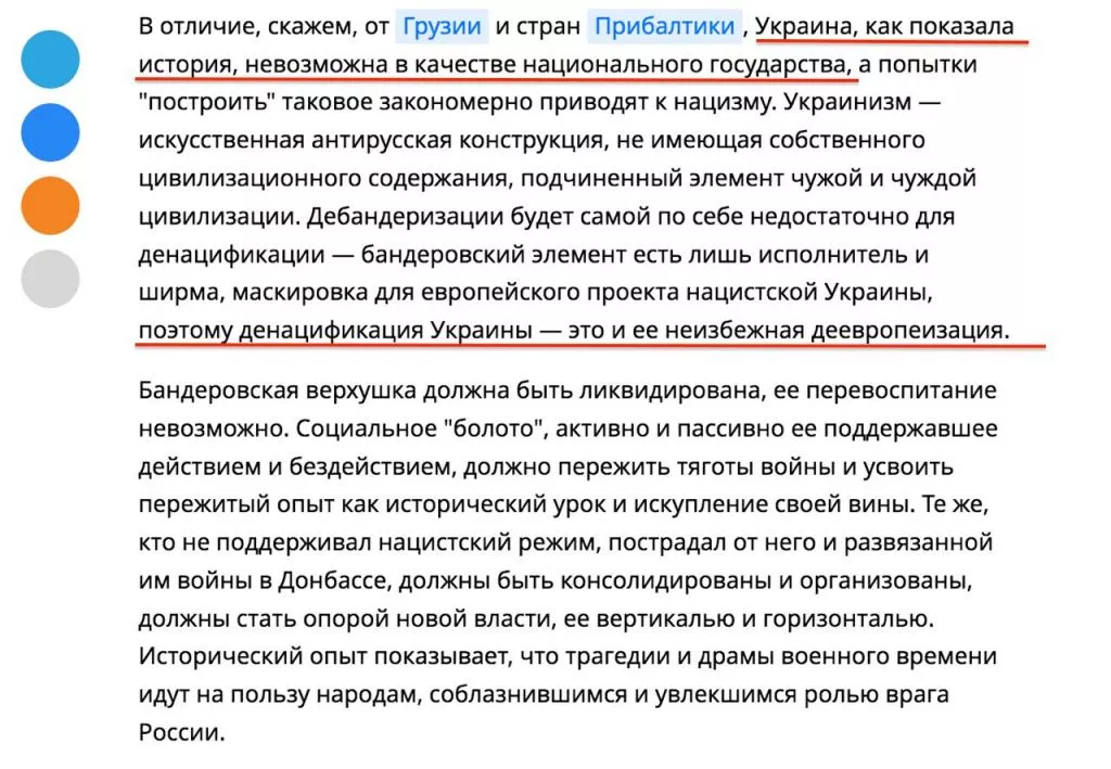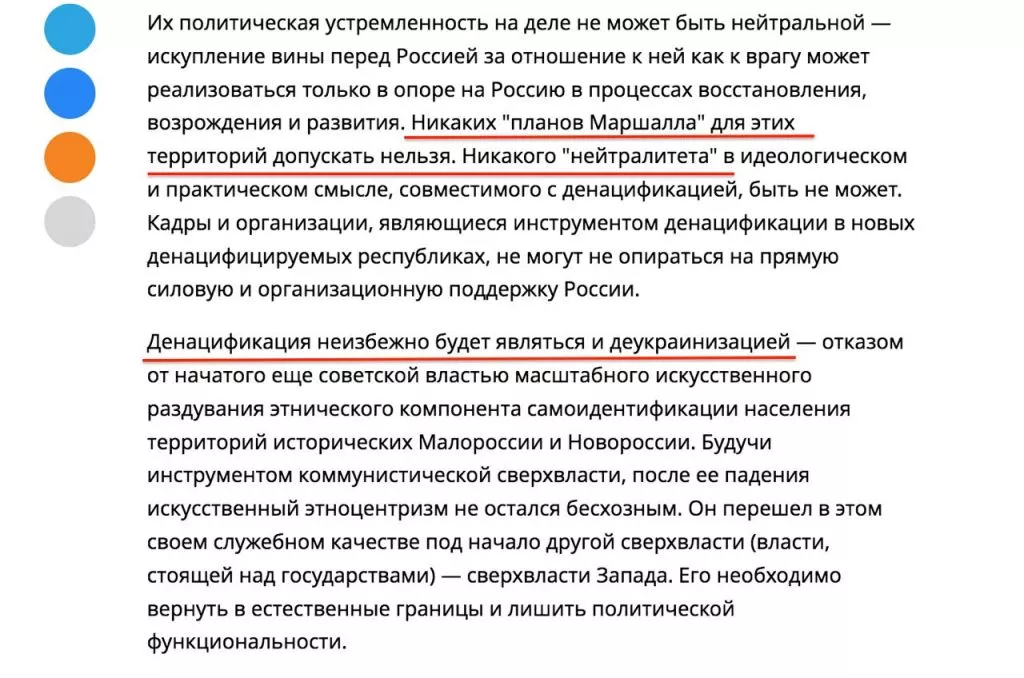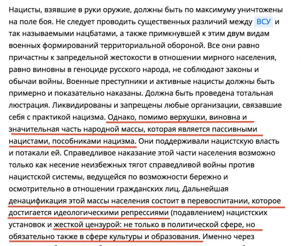Українців, які не підтримали російських загарбників там називають “посібниками нацистів”, на яких очікує “денацифікація через ідеологічні репресії. Досягнути це пропонується жорстокою цензурою в політиці, культурі та освіті на захоплених територіях.