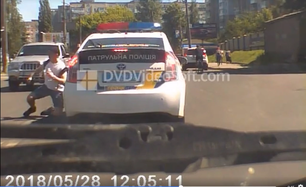 На щастя, удар був не дуже сильним, потерпілий піднявся та полаявся з горе-водієм за кермом патрульного авто.