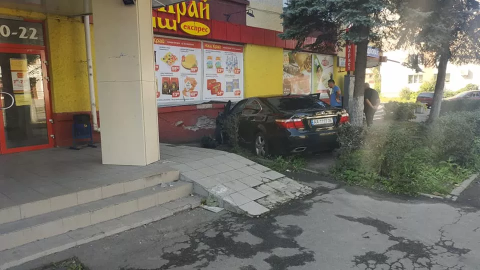 “12.08.18 Лексус на укробляхах влетів в магазин Наш Край на пр.Перемоги 14. Удар був такої сили, що вітрини повалило. Водія і досі шукають”, – йдеться у дописі.