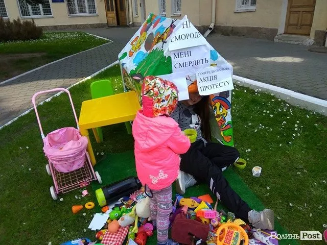 Жінка, яку звати Анна, 16 травня встановила біля міськради дитячий будиночок, на який повісила написи “ДПЗ Цукровий задихаються”, “Попереджувальна акція протесту” тощо, – пише ВолиньPost.