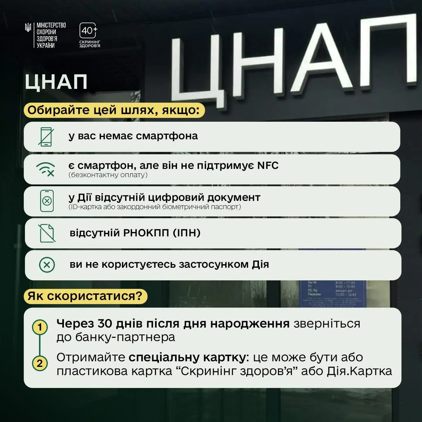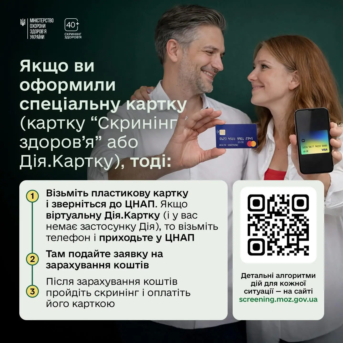 Щоб скористатися програмою, після 30 днів від дня народження людина отримує запрошення у застосунку «Дія». Після підтвердження участі потрібно оформити Дія.Картку або використати вже наявну. Протягом семи днів на картку надійде 2000 гривень, які можна витратити виключно на проходження скринінгу у визначених медичних закладах.