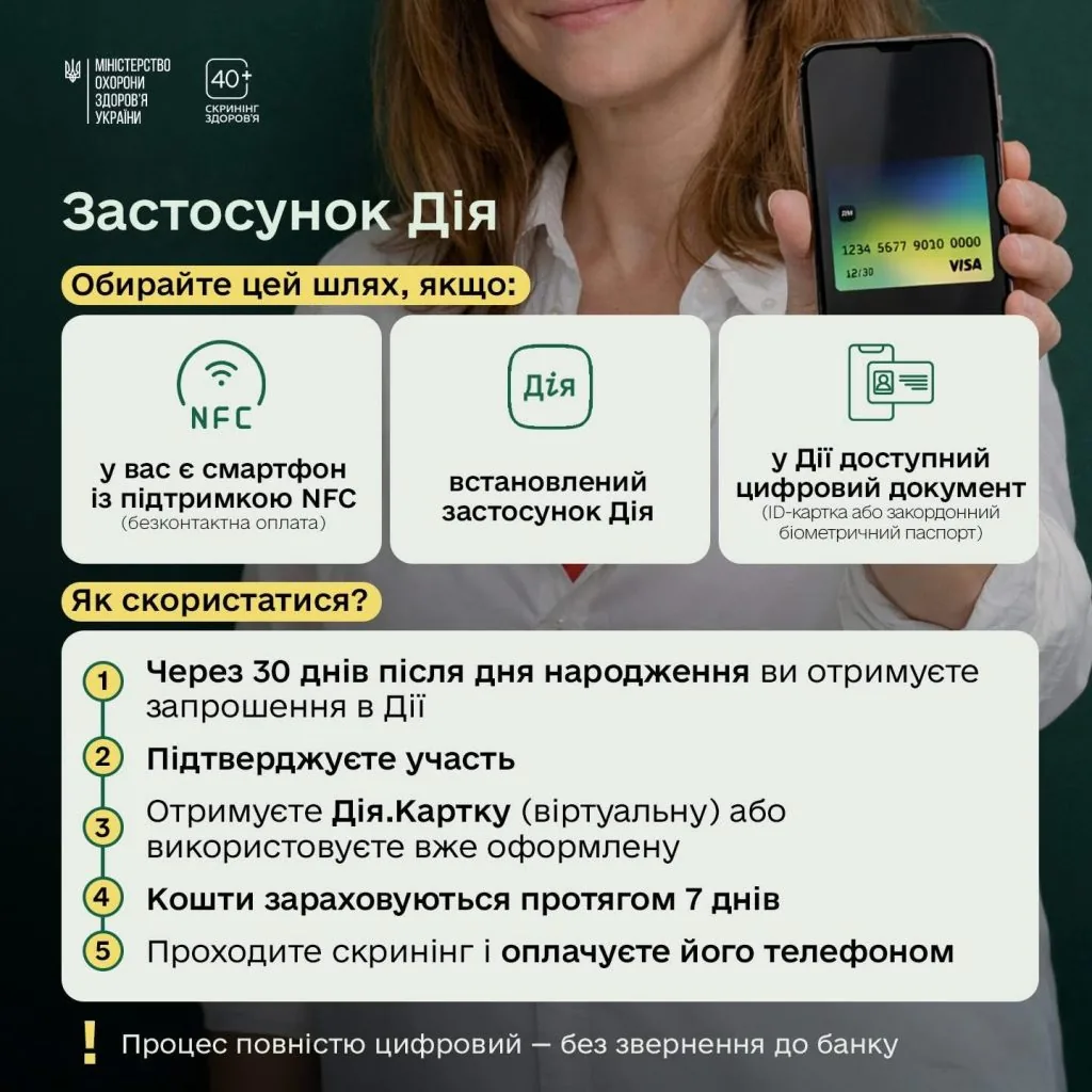 Далі учасник програми має обрати медзаклад на сайті Міністерства охорони здоров’я та записатися на обстеження у зручний час. Після проходження скринінгу оплата здійснюється карткою програми.