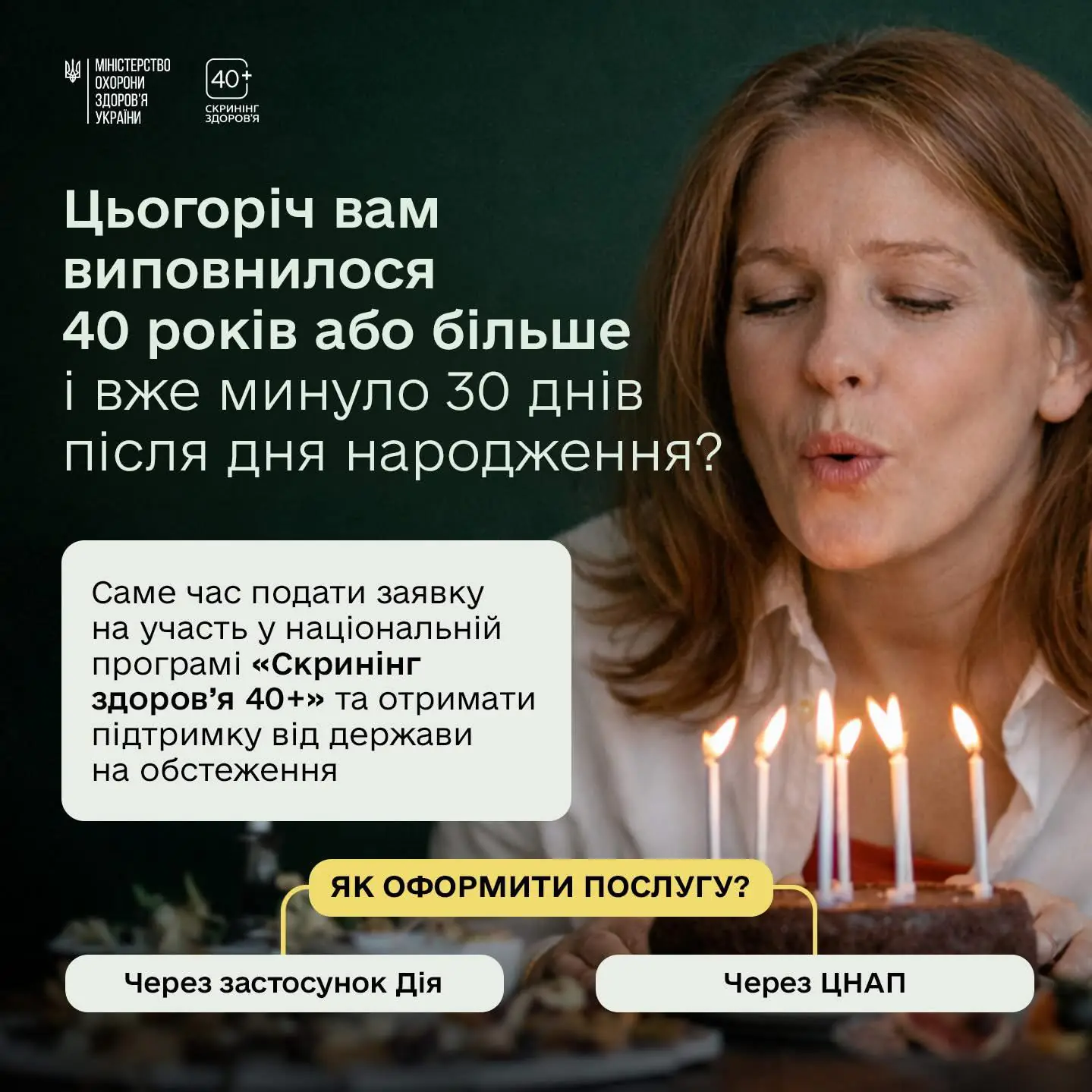 Національна програма «Скринінг здоров’я 40+» створена для того, щоб зробити профілактичні медичні обстеження доступними для українців віком від 40 років. Її мета — раннє виявлення серцево-судинних захворювань, цукрового діабету та проблем із ментальним здоров’ям.