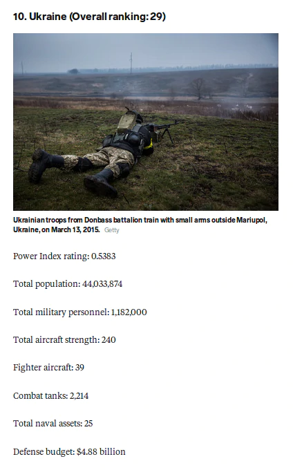Як зазначається, у рейтингу українська армія посіла 10 місце. За даними аналітиків, військовий бюджет України становить $4,88 млрд. Українська армія складається з 1,1 млн військовослужбовців, 2214 танків, 240 військових повітряних суден, з яких 39 винищувачів, і 25 морських суден.