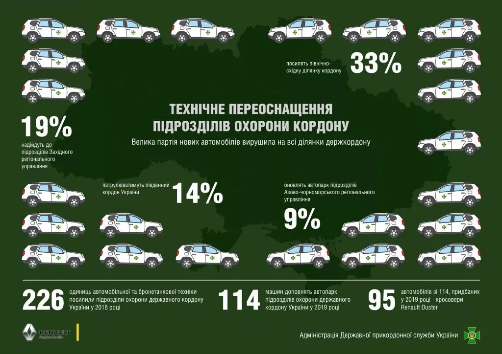Зі 114 одиниць автомобільної техніки, яка надійде до прикордонних підрозділів у 2019 році, 95 – кросовери Renault Duster.