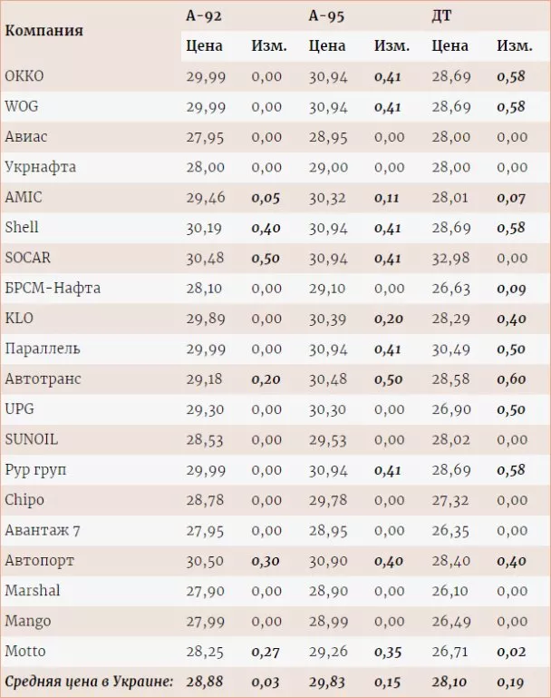 Зокрема, на WOG і ОККО бензин марки А-95 подорожчав на 41 коп./л, до 30,94 грн/л, дизельне пальне – на 58 коп./л, до 28,69 грн/л. У мережі AMIC ціни на бензини зросли в середньому на 5-11 коп./л, а ДП – на 7 коп./л. SOCAR підвищила вартість бензину на 41-50 коп./л.