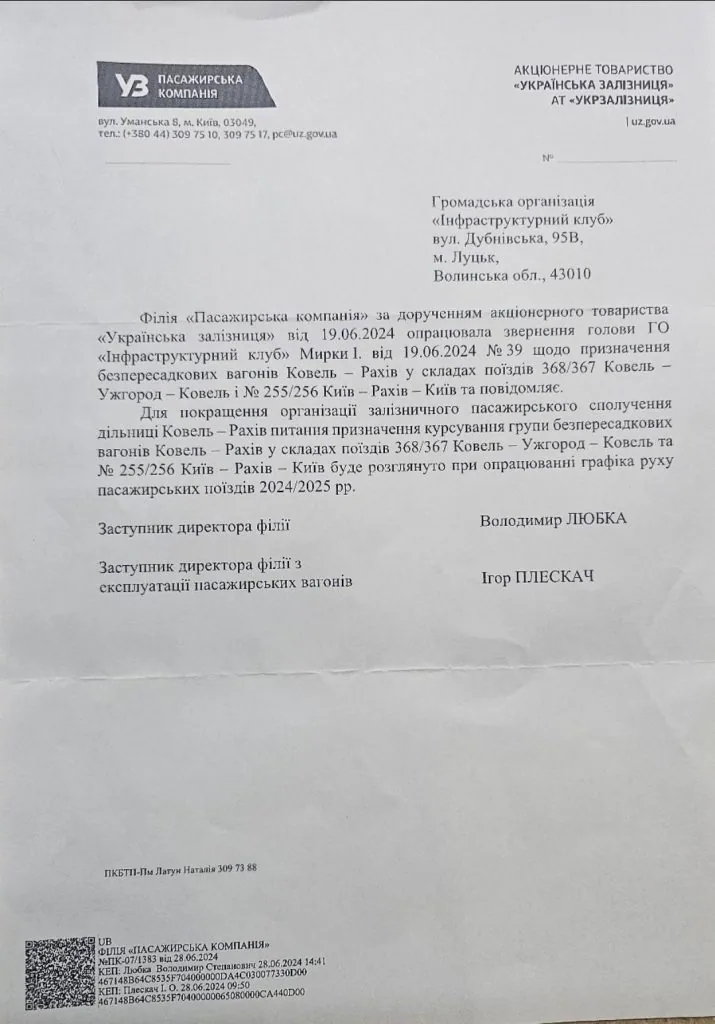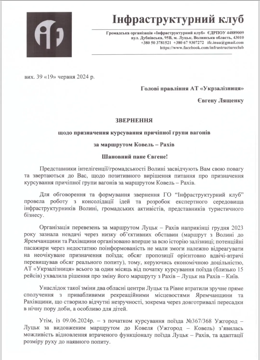 Маршрут запустили менше року тому. Потяг рухався через станції Ковель, Луцьк, Рівне, Львів, Івано-Франківськ, Татарів, Ясіню, Рахів.
