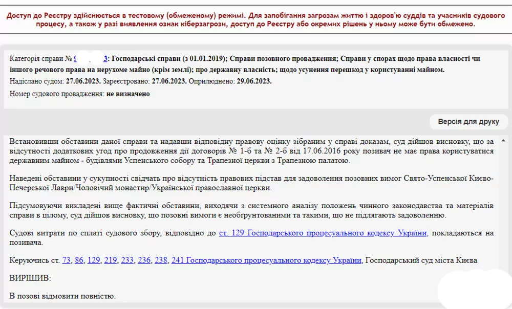 «Суд дійшов висновку, що за відсутності додаткових угод про продовження дії договорів № 1-б та № 2-б від 17 червня 2016 року позивач не має права користуватися державним майном, будівлями Успенського собору та Трапезної церкви з Трапезною палатою. Наведені обставини у сукупності свідчать про відсутність правових підстав для задоволення позовних вимог Свято-Успенської Києво-Печерської Лаври (Чоловічий монастир) Української православної церкви», – зазначено у рішенні суду.