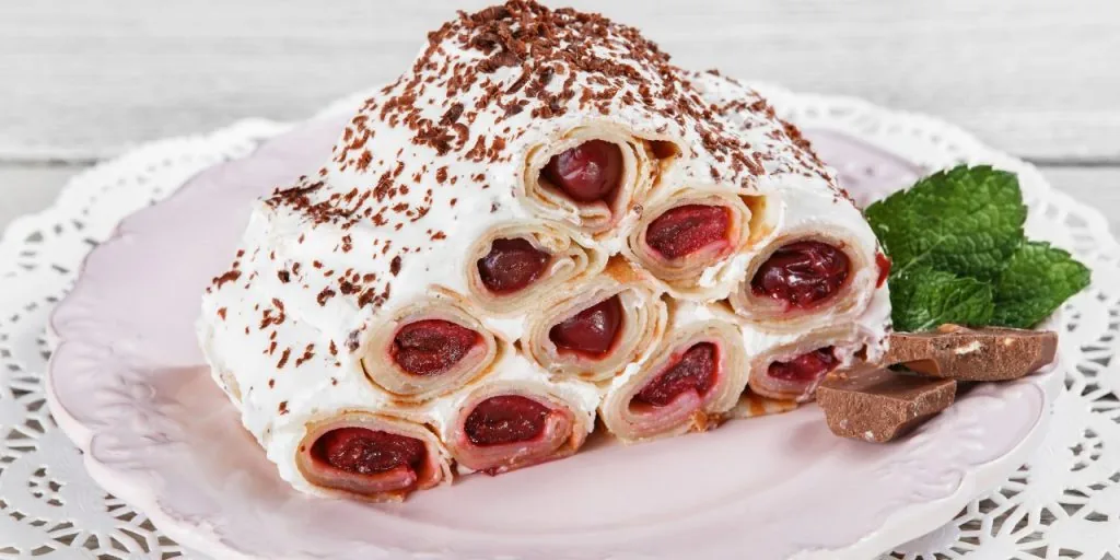 Чудовий торт Монастирська хата є одним з найбільш “зимових” десертів. Це не тільки смачний, але й красивий десерт, що нагадує присипані снігом дрова. Ідея страви досить проста – трубочки з тіста наповнюються вишнею, складаються одна на одну у формі піраміди і змащуються сметанним кремом. Готовий десерт виходить кисло-солодким, з ягідною ноткою, і дуже легким для шлунка.