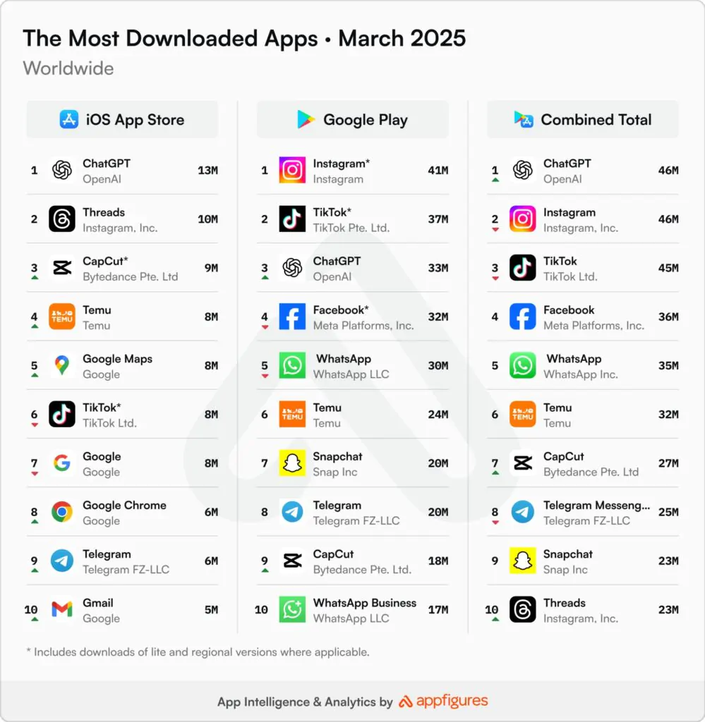 Як повідомляє компанія Appfigures, що займається аналітикою додатків, у березні ChatGPT став найбільш завантажуваним додатком у світі, обійшовши Instagram та TikTok, які традиційно займали перші місця у глобальному рейтингу.