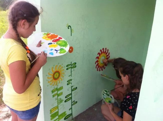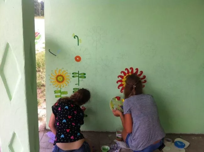 У селищі Люблинець, що у Ковельському районі, юні художники розмалюють зупинку громадського транспорту.