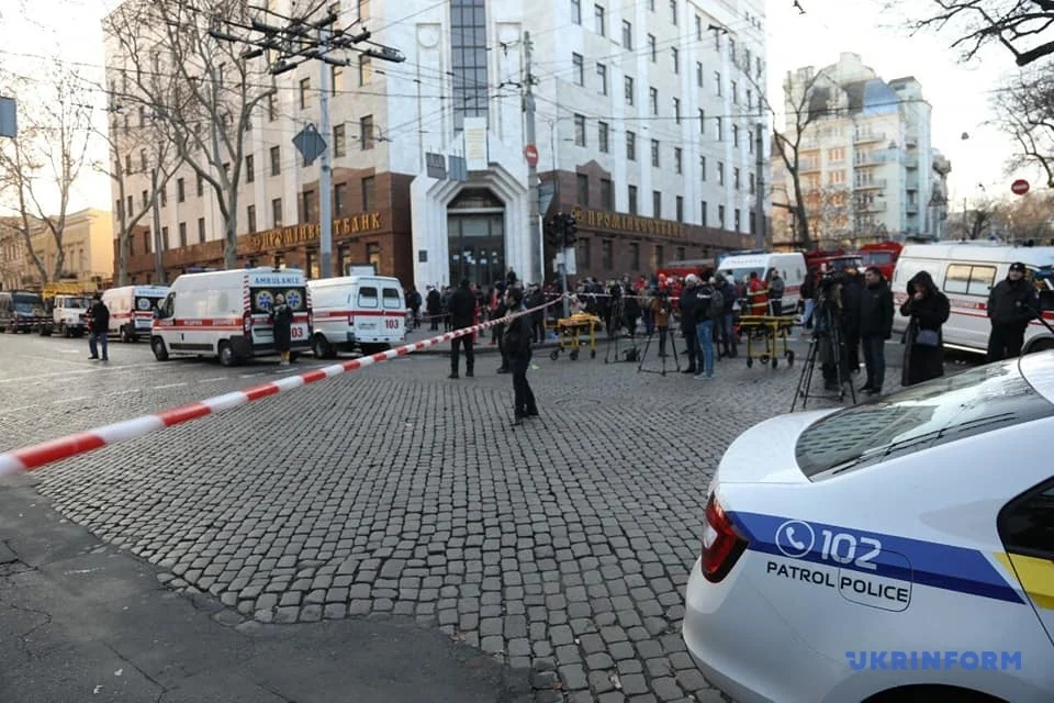Частину постраждалих, яких не госпіталізовано, розмістили у сусідній будівлі Промінвестбанку.