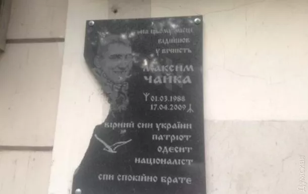 В Одесі на Олександрівському проспекті невідомі пошкодили меморіальну дошку лідеру організації “Слава і честь” Максиму Чайці.