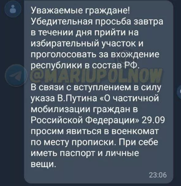«В связи со вступлением в силу указа в. путина «О частичной мобилизации граждан в российской федерации» 29.09 просим явиться в военкомат по месту прописки. При себе иметь паспорт и личные вещи».