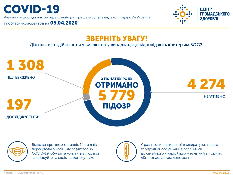 Нагадаємо, станом на ранок 5 квітня зафіксували 1251 випадок коронавіру, 32 пацієнти померли, 25 одужали.