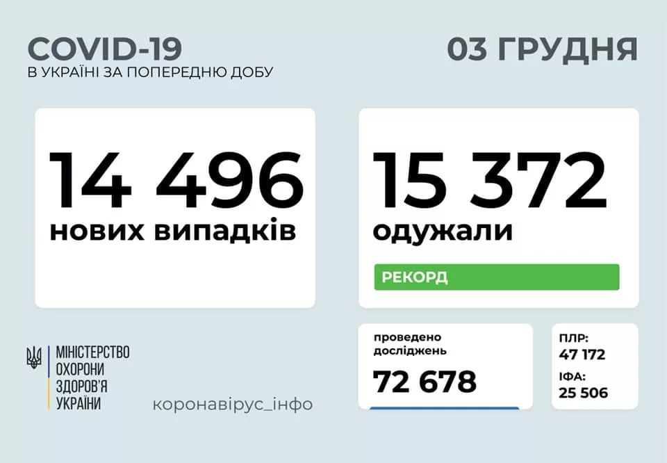 Станом на ранок 3-го грудня в Україні зафіксували 772 760 випадків захворювань на COVID-19, одужали 384 426 осіб, 12 960 випадків завершились летально. за весь час пандемії в країні проведено 4 654 206 ПЛР-тестувань.