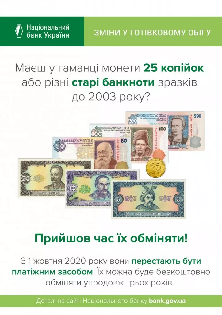 Банкноти гривні старих зразків, уведені в обіг до 2003 року, перестануть бути платіжним засобом в Україні та будуть вилучені з обігу з 1 жовтня 2020 року. Тобто ними не можна буде розраховуватися за товари чи послуги.