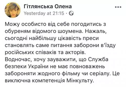 Несподівано з ним погодилась речниця СБУ Олена Гітлянська. Вона написала у своєму Facebook (орфографія оригіналу збережена): «Можу особисто від себе погодитись з обуреням відомого шоумена. Нажаль, сьогодні найбільшу цікавість преси становлять саме питання заборони в’їзду російських співаків та акторів. Водночас, хочу зауважити, що Служба безпеки України не має повноважень забороняти жодного фільму чи серіалу. Це виключна компетенція Мінкульту».