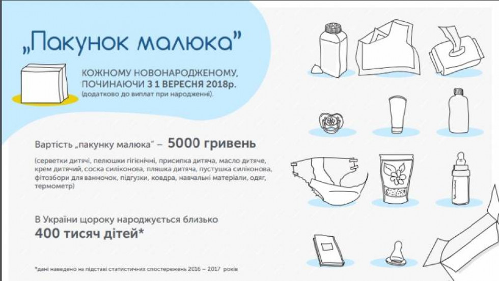 В Україні сім’ям при народженні дитини видаватимуться спеціальні дитячі набори “baby box”, а також планується з початку наступного року компенсація в 1,5 тисячі гривень для найму няні з догляду за дитиною.