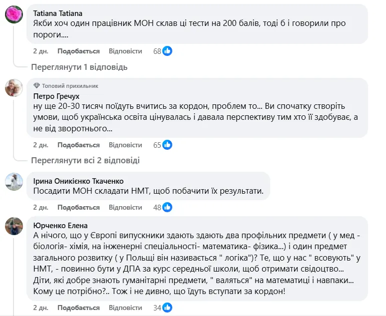 “Це вже щоб розігнати всіх випускників по світу. Вже і так рівень НМТ дорівнює бакалаврату, а ще мало. Не всіх перелякали”, “Ну, ще 20-30 тисяч поїдуть вчитись за кордон, проблем то…”, “Якби хоч один працівник МОН склав ці тести на 200 балів, тоді б і говорили про пороги…” – пишуть у коментарях.