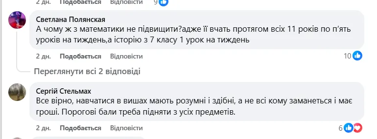 “Все правильно, навчатися в вишах мають розумні й здібні, а не всі кому заманеться і має гроші. Порогові бали треба підняти з усіх предметів”, – вважає один з користувачів.
