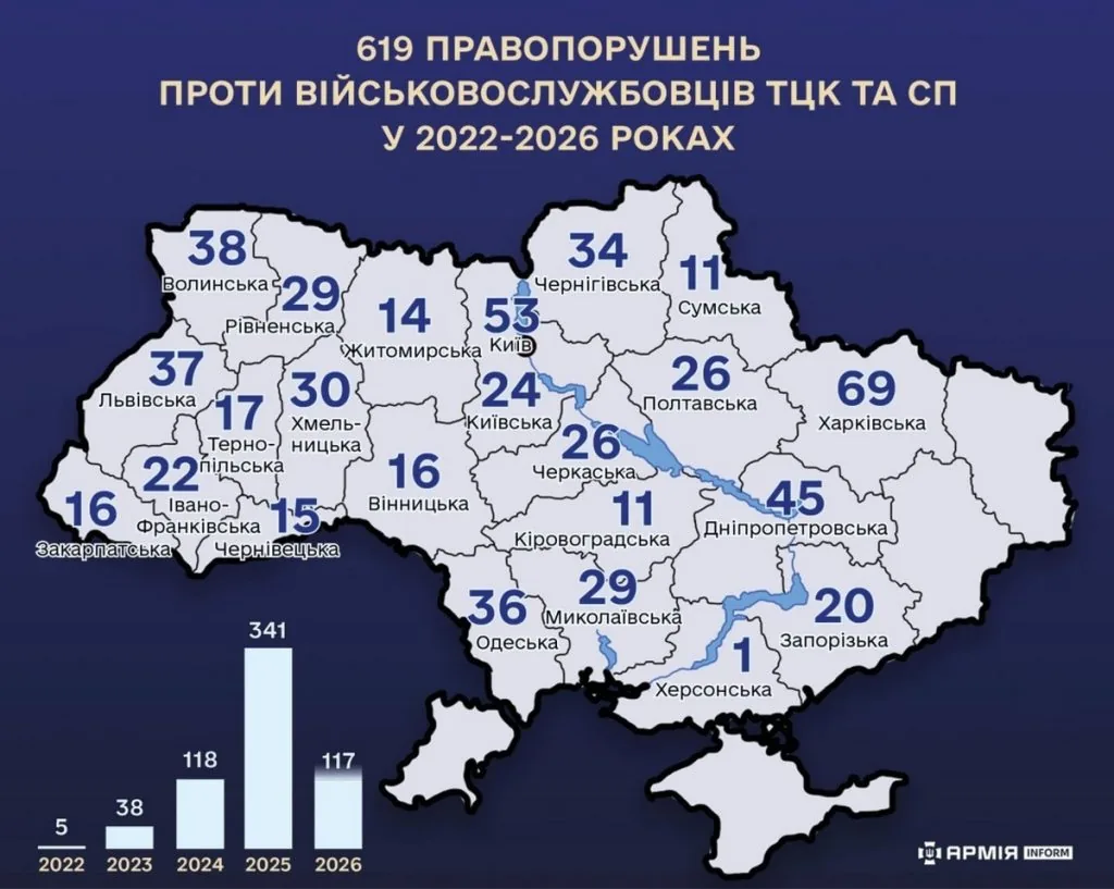 З 24 лютого 2022 року в Україні зареєстрували 619 випадків правопорушень щодо військовослужбовців Територіальних центрів комплектування та соціальної підтримки.