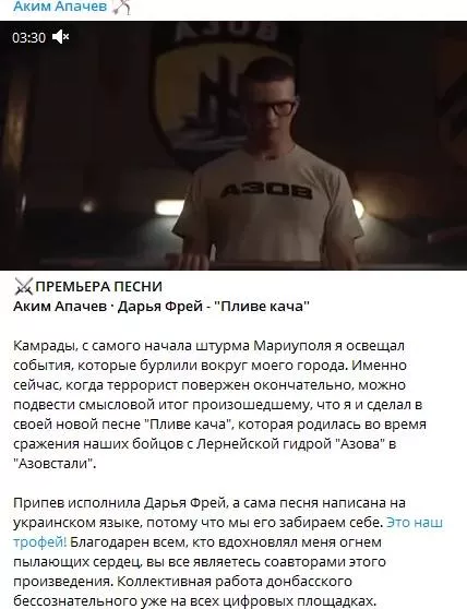 Уродженець Маріуполя, а нині російський співак і журналіст Акім Апачев спільно з маловідомою виконавицею Дарією Фрей заспівали про те, що «забирають собі українську» як трофей пише Обозреватель.